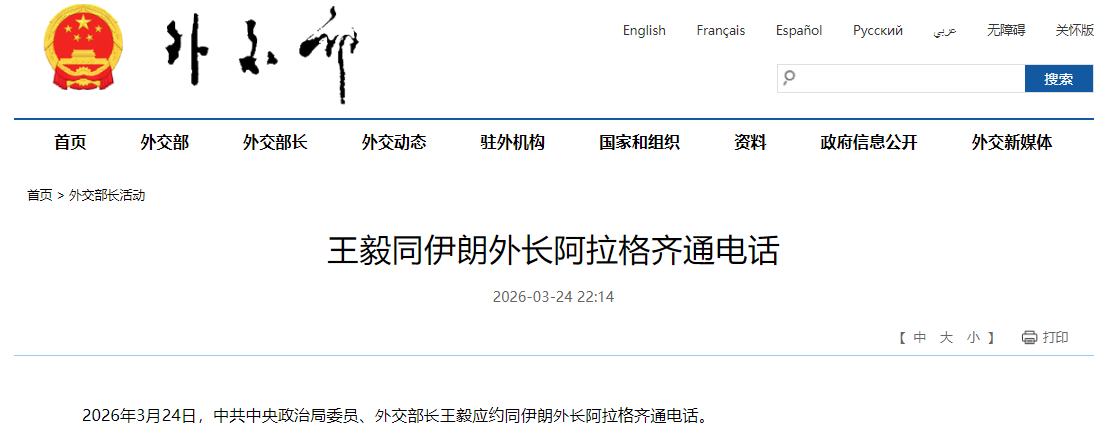 中國外交部網頁截圖 據中國外交部官網消息,王毅指出,談起來總比打下去好。這符合伊朗國家和人民的利益,也呼應了國際社會普遍願望。希望各方抓住一切和平機會和窗口,盡快啟動和談進程。中方將繼續秉持客觀公正立場,反對侵犯別國主權,積極勸和止戰,致力於地區和平穩定。