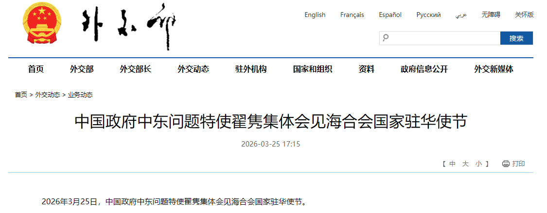 中國外交部網站截圖 翟雋表示,當前戰事嚴重危及中東地區安全穩定。中方理解並支持海合會國家維護自身主權、安全和領土完整的努力,願繼續同海方保持密切溝通,為推動局勢降溫作出不懈努力。 海合會國家駐華使節介紹了對當前局勢的看法並表示,期待中方為推動地區盡早恢復和平穩定發揮更大作用。