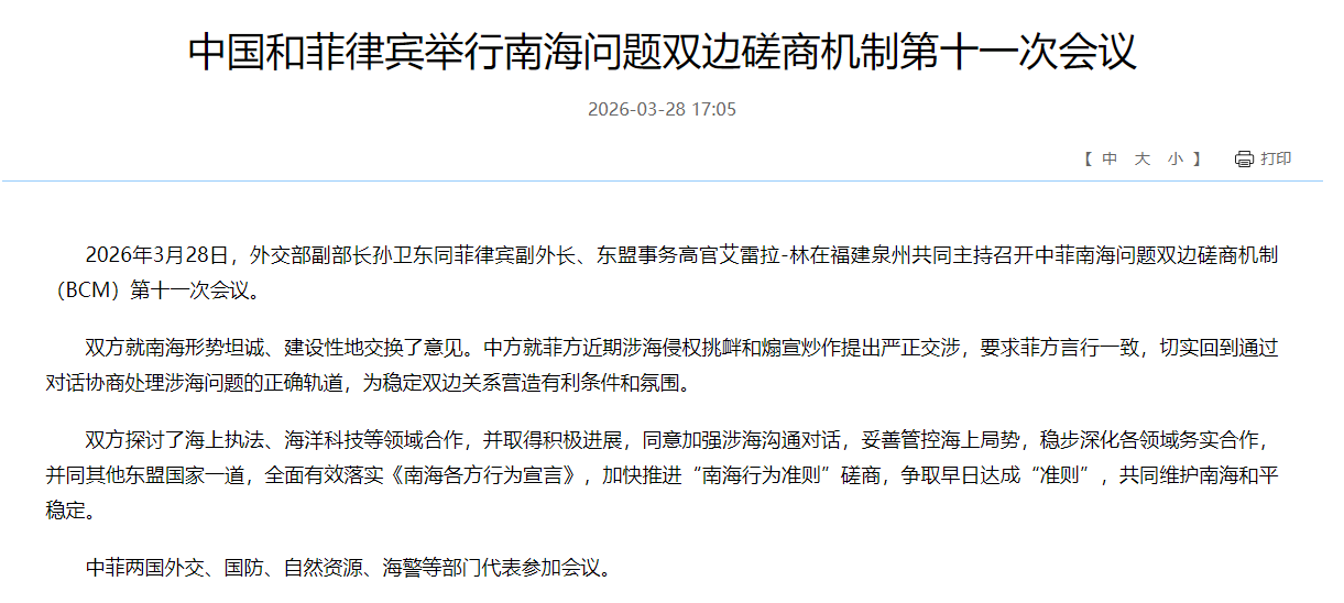 中國外交部3月28日發布消息稱,外交部副部長孫衛東同菲律賓副外長、東盟事務高官艾雷拉-林當天在福建泉州共同主持召開中菲南海問題雙邊磋商機制第十一次會議。中菲上次舉行該機制會議是在去年1月。