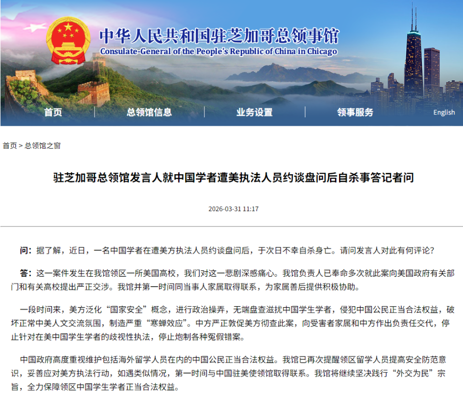 中國駐芝加哥總領館網站截圖 中國駐芝加哥總領館發言人當天說,這一案件發生在該館領區一所美國高校,該領館對這一悲劇深感痛心。領館負責人已奉命多次就此案向美國政府有關部門和有關高校提出嚴正交涉。該領館並第一時間同當事人家屬取得聯繫,為家屬善後提供積極協助。 中國駐芝加哥總領館發言人指出,一段時間來,美方泛化“國家安全”概念,進行政治操弄,無端盤查滋擾中國學生學者,侵犯中國公民正當合法權益,破壞正常中美人文交流氛圍,製造嚴重“寒蟬效應”。中方嚴正敦促美方徹查此案,向受害者家屬和中方作出負責任交代,停止針對在美中國學生學者的歧視性執法,停止炮製各種冤假錯案。 該發言人還說,中國政府高度重視維護包括海外留學人員在內的中國公民正當合法權益。中國駐芝加哥總領館已再次提醒領區留學人員提高安全防範意識,妥善應對美方執法行動,如遇類似情況,第一時間與中國駐美使領館取得聯繫。中國駐芝加哥總領館將繼續堅決踐行“外交為民”宗旨,全力保障領區中國學生學者正當合法權益。(完) 【編輯:彭玉婷】