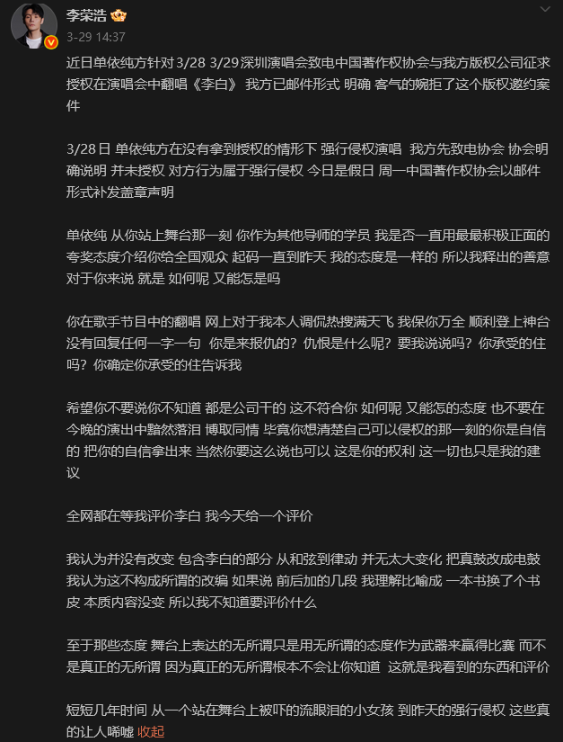 圖源:“李榮浩”微博賬號截圖 原曲《李白》由李榮浩作詞作曲並擔任製作人。去年《歌手》節目中,單依純將《李白》改編為電子遊戲風格,加入“我本是輔助,今晚來打野”等念白,被網友稱為“遊戲戰歌”,迅速火出圈,引發全網熱議。有網友留言稱:“這首歌本來就不火”、“翻唱給了新生命”等。 今年3月29日,李榮浩在微博連發多條長文,直指單依純在深圳演唱會“強行侵權”演唱《李白》。他明確表示,單依純團隊曾就3月28日、29日兩場演出向中國著作權協會及李榮浩版權公司申請授權,但“我方已通過郵件明確、客氣地婉拒”。然而,3月28日晚,單依純仍在明知未獲許可的情況下登台演唱該曲。中國著作權協會隨後確認:“並未授權”,定性為“強行侵權”。 李榮浩還從專業角度駁斥所謂“改編”說法:“從和弦到律動並無太大變化,僅僅把真鼓改成電鼓,這不構成所謂的改編。”他比喻道:“就像一本書換了個書皮,本質內容沒變。”依據《著作權法》第三十八條,公開表演他人作品必須事先取得許可並支付報酬;即便構成法律意義上的改編,即在原作基礎上進行實質性修改並形成獨創性表達,仍需原作者授權。 有內地媒體分析認為,這場風波暴露出行業存在漏洞。一方面,主辦方將版權視為“可事後補救”的程序,奉行“先演再說”的灰色邏輯;另一方面,藝人以“團隊負責”推卸責任,導致責任鏈條斷裂。更嚴峻的是,侵權成本長期偏低:一場熱搜帶來的流量收益遠超賠償金額,使版權規則淪為軟約束。 北京願法律師事務所律師高芳芳指出,《著作權法》規定,音樂作品的詞、曲著作權可分割且相互獨立。商業演唱須同時獲得詞、曲作者授權,缺一即構成侵權。李榮浩身兼《李白》詞曲作者,其拒絕具有完全法律效力。高芳芳強調,多數流行歌曲由不同人創作,切勿抱有“獲一方授權即可”的僥倖心理。 隨著武漢、鄭州場次啟動退票,這場風波已超越個體糾紛,成為一次關於版權底線的公共警示。業內人士分析指:流量從來不是通行證。在版權面前,每個人都該明白:該這樣,就必須認。唯有讓規則跑在熱搜前面,行業才能真正行穩致遠。(完) 【編輯:彭玉婷】