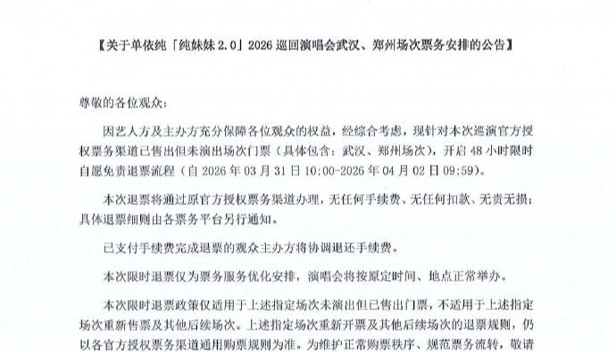 香港中通社3月31日電(香港中通社記者 葉永成)北京時間3月30日深夜,中國歌手單依純巡迴演唱會武漢、鄭州場次突宣布啟動48小時免責退票,並發布致歉聲明。導火索正是前一日另一名音樂人李榮浩公開控訴單在深圳場“明知授權被拒,仍強行演唱《李白》”的版權風波。一場本可避免的侵權爭議,正迅速演變為對整個演藝行業版權底線的拷問。