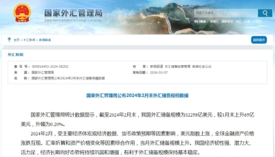香港新聞網4月8日電 中國國家外匯管理局4月7日發布的數據顯示,截至2026年3月末,中國外匯儲備規模為33421億美元,較2月末下降857億美元,降幅為2.5%。