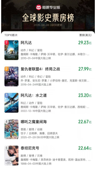 香港新聞網4月10日電(記者 錢林霞)據貓眼專業版最新數據顯示,截至4月9日,國產動畫電影《哪吒之魔童鬧海2》(簡稱《哪吒2》)全球票房攀升至22.67億美元,正式超越經典影片《泰坦尼克號》的22.64億美元,躋身全球影史票房榜第4位。除了票房這一核心收入來源,《哪吒2》IP已延伸至全產業鏈。《哪吒2》周邊熱銷的背後,不僅是電影熱度與IP價值的延續,更折射出優質內容和成熟衍生品市場相互賦能的良性循環。