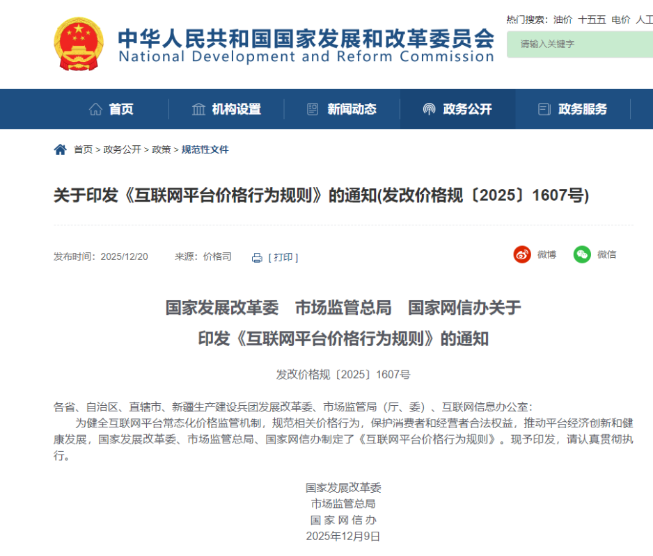 關於印發《互聯網平台價格行為規則》的通知。圖源:中國國家發改委網頁截圖 《規則》全文共七章29條,訂明平台不得虛假宣傳補貼力度,嚴禁強制商戶參與促銷並分攤費用,更不得通過算法實施“大數據殺熟”或收取未明示的額外費用。此前近四個月的過渡期,已要求企業完成自查整改。 商務部研究院副研究員洪勇指出,《規則》的核心價值在於“三個明確”:一是明確了價格行為的合規邊界,讓平台企業知道什麼能做、什麼不能做;二是明確了經營者的自主定價權,防止平台利用優勢地位進行不合理干預;三是明確了消費者的知情權和選擇權,讓價格更透明、消費更安心。這對於構建公平、透明、有序的平台經濟生態具有重要意義。 相關監管部門在4月8日的合規指導會上通報了部分平台存在的違規問題,要求立即糾正,建立長效合規機制。市場監管總局價監競爭局有關負責人表示,平台經濟的健康發展,不僅是平台企業本身,更是整個生態的持續繁榮。盡管許多平台企業在發展過程中逐步健全了合規管理機制,但在收費行為方面,其內部合規管理制度仍不够完善,導致平台企業收費風險防控不足。 公開數據顯示,中國平台經濟覆蓋超9億網民、數千萬經營主體,2024年市場規模達25.2萬億元人民幣,但收費名目繁雜、抽成不透明等問題長期困擾中小商戶。(完) 【編輯:彭玉婷】