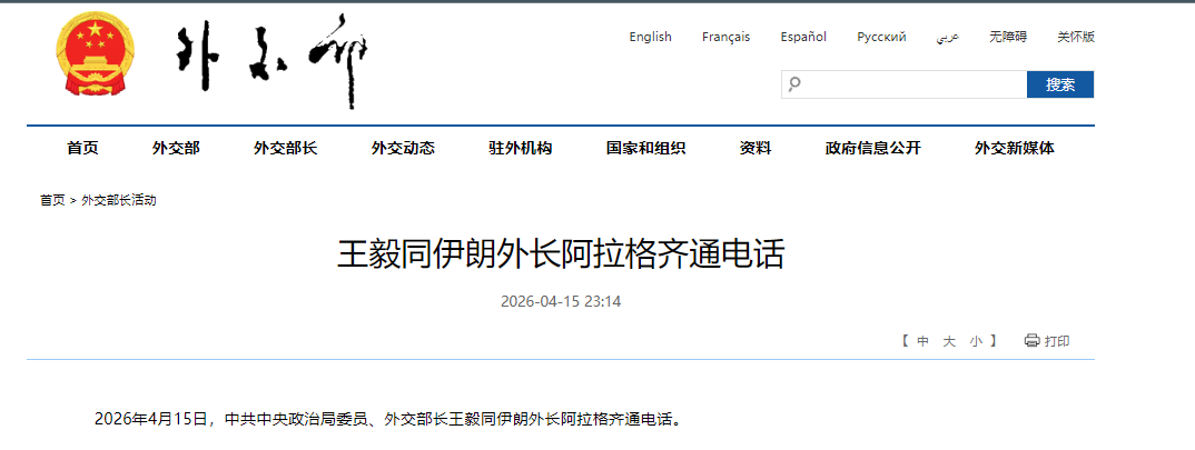 香港中通社4月16日電 中國外交部長王毅15日同伊朗外長阿拉格齊通電話。王毅表示,中方支持保持停火和談判勢頭,這符合伊朗人民根本利益,也是地區國家和國際社會共同期盼。