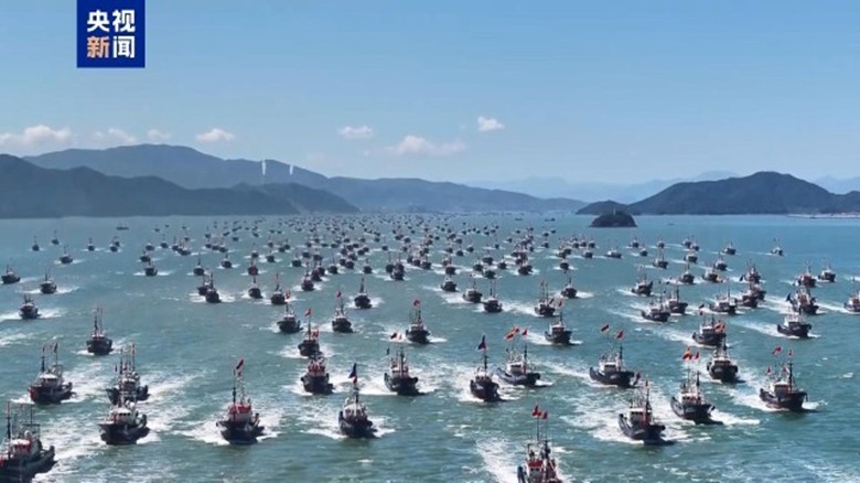 2025年9月16日中午12時,中國東海結束了四個半月的伏季休漁,全面開捕。圖為浙江寧波象山縣,當地漁民舉行盛大的開船儀式。央視新聞資料圖
