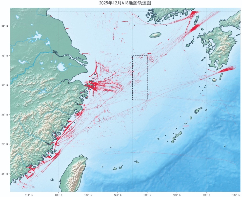 上海海洋大學數據中心提供給《環球時報》的一幅數據圖則顯示,外媒報道中,2025年12月“上千艘中國漁船在某一海域集結成兩列數百公里‘平行隊形’”的情況并不存在。該中心通過中國漁船的AIS數據繪製的中國近海漁船AIS分布熱點圖中,在外媒報道劃定的區域中,并未出現漁船密集聚集的情況。