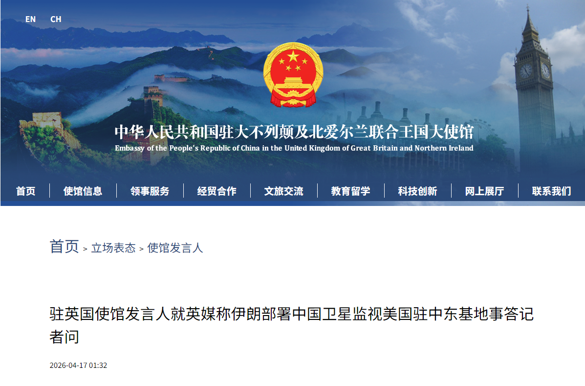 圖源:中國駐英國大使館網站截圖 據中國駐英國大使館17日消息,發言人就英媒稱伊朗部署中國衛星監視美國駐中東基地一事答記者問時說,中國外交部已就相關問題作出回應,並重申,該報道不屬實。伊朗危機是一場本不該發生的戰事,起源各方都很清楚。中方堅決反對一些人編造謠言關聯中方。 另據中國外交部網站消息,中國外交部長王毅16日在北京會見意大利副總理兼外長塔亞尼時表示,中方一貫主張通過對話協商政治解決國際爭端,反對使用武力。美國和以色列對伊朗的戰爭本不應發生,戰事延宕已對國際能源安全和霍爾木茲海峽航道安全造成嚴重影響,當務之急是推動美伊重回談判,尋求政治解決。中方始終秉承客觀公正立場,一直積極致力於促和止戰,支持巴基斯坦積極斡旋,願同各方保持溝通,繼續為此發揮建設性作用。(完) 【編輯:彭玉婷】