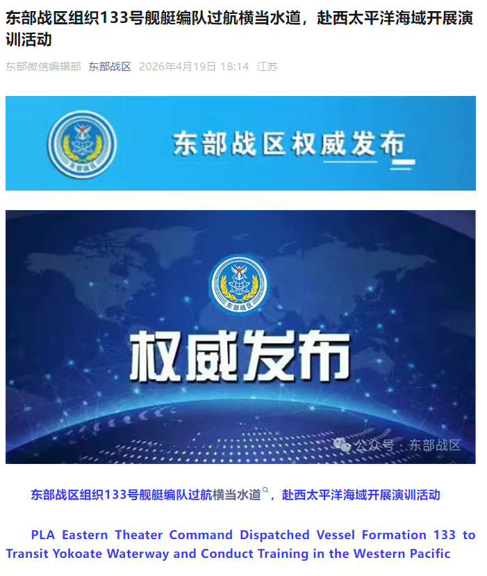 香港中通社4月19日電  中國人民解放軍東部戰區新聞發言人徐承華陸軍大校19日表示,當日,東部戰區組織133號艦艇編隊過航橫當水道,赴西太平洋海域開展演訓活動,檢驗部隊遠海作戰能力。