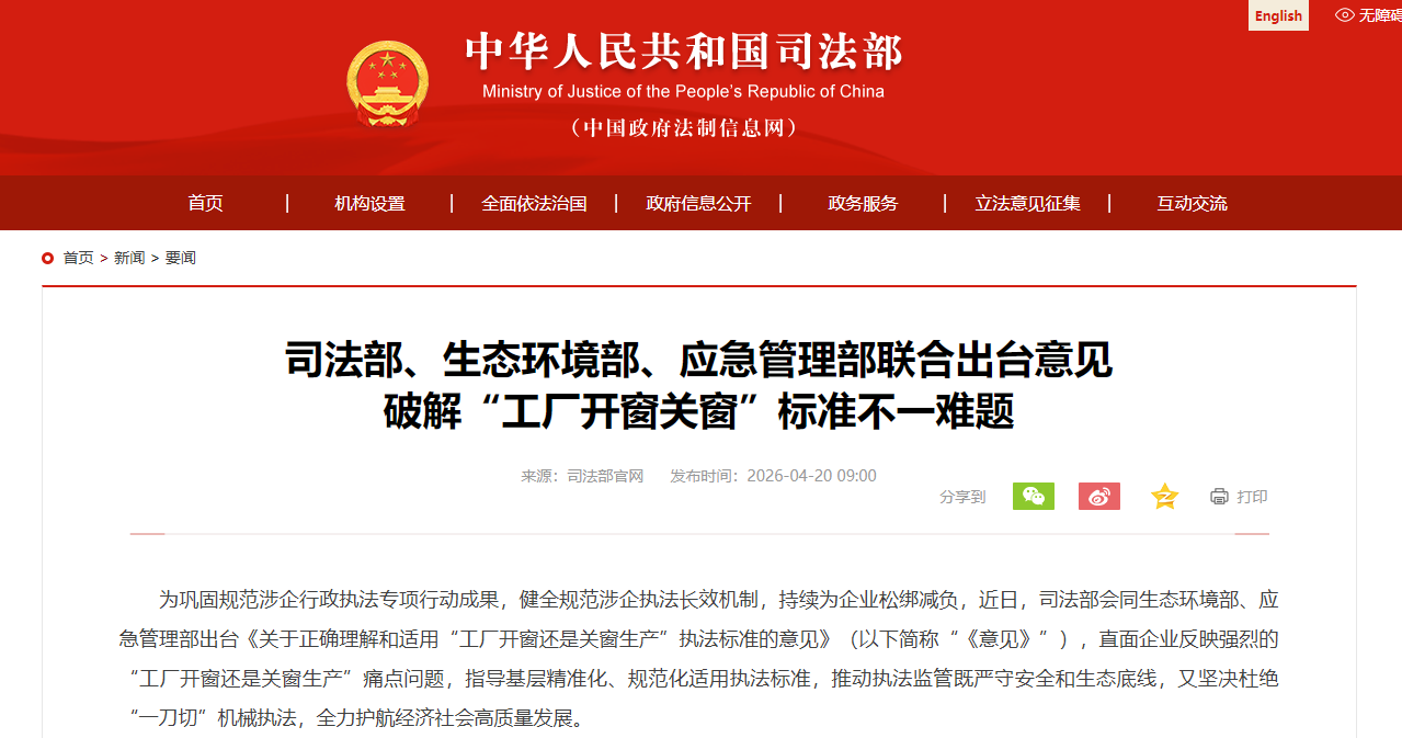 中國司法部官網截圖 據“司法部微信公眾號”20日消息,為鞏固規範涉企行政執法專項行動成果,健全規範涉企執法長效機制,持續為企業鬆綁減負,《意見》在總結地方實踐經驗的基礎上,多維度系統施策,靶向化解執法難題。 一是聚焦“開關窗”核心要求,精準破解監管難題。明確標準內涵及例外規定,從生態環境保護角度,無法封閉或密閉的,可以採取清潔原料、廢氣局部收集處理等措施,不是“一律關窗”;從安全生產角度,當危險物超出安全閾值時,需要採取風機聯鎖等通風措施,不是“一直開窗”,要求執法人員根據現場實際研判,為企業生產經營留足空間。 二是建立健全聯合執法機制,打通監管銜接堵點。強化執法程序保障,要求各地生態環境、應急管理部門嚴格落實有關規定,建立健全協同聯動機制,統籌制定聯合檢查計劃,開展聯合執法,加強協同治理,及時會商解決監管要求不一致的問題。 三是強化協同指導服務,兼顧安全與發展。著力提升基層執法人員精準執法、服務企業能力水平,督促各地生態環境、應急管理部門統籌生產經營與安全生產、生態環境保護的關係,不斷增強服務意識,指導企業嚴格執行法律法規及標準規範,科學規範設置設備設施,同步滿足環保和安全要求,切實幫助企業破解兩難困境。(完) 【編輯:彭玉婷】