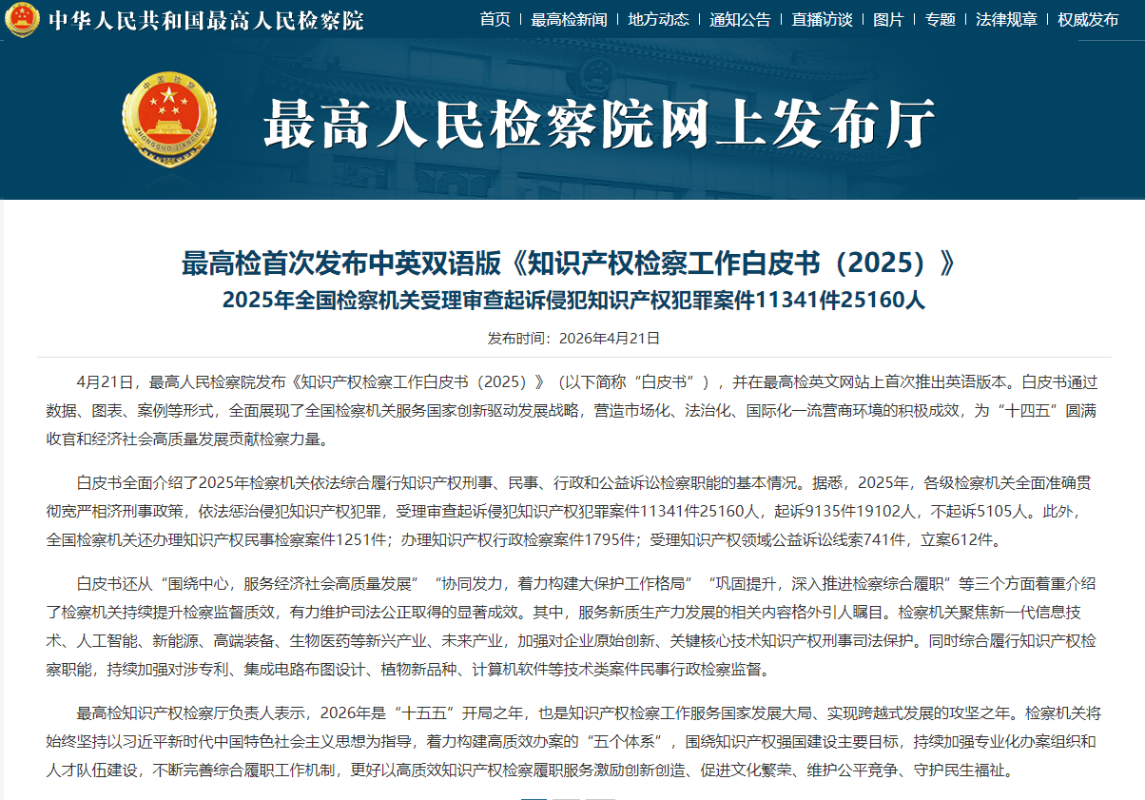 香港中通社4月21日電 中國最高人民檢察院21日發布《知識產權檢察工作白皮書(2025)》,並在最高檢英文網站上首次推出英語版本,介紹去年知識產權檢察實績。