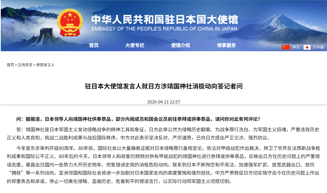 圖源:中國駐日本大使館官網截圖 發言人說,靖國神社是日本軍國主義發動侵略戰爭的精神工具和象徵,日方此舉公然為侵略歷史翻案、為戰爭罪行洗白、為軍國主義招魂,嚴重違背歷史正義和人類良知,挑戰二戰勝利成果與戰後國際秩序。 發言人表示,今年是東京審判開庭80周年。80年前,國際社會以大量確鑿證據對日本侵略罪行蓋棺定論,依法對甲級戰犯作出裁決,捍衛了世界反法西斯戰爭勝利成果和國際公平正義。80年後的今天,日本領導人和政客仍頻頻對供有甲級戰犯的靖國神社進行參拜或供奉祭品,反映出日方在歷史問題上的嚴重錯誤態度,暴露出日國內一些勢力大開歷史倒車、兜售錯誤史觀的消極危險動向。聯繫到日本不斷掏空和平憲法、加速強軍擴武、放寬武器出口、放風“擁核”等一系列動向,亞洲鄰國和國際社會將進一步加劇對日本國家走向的高度警惕和強烈擔憂。中方嚴肅敦促日方切實恪守迄今在歷史問題上作出的鄭重表態和承諾,停止一切美化侵略、歪曲歷史、危害和平的錯誤言行,以實際行動同軍國主義徹底切割。 另據日本媒體最新消息,日本首相高市早苗22日向靖國神社供奉“玉串料”(祭祀費)。此外,126名來自日本跨黨派國會議員聯盟“大家一起參拜靖國神社”的成員22日集體參拜供奉有二戰甲級戰犯的靖國神社。 靖國神社位於東京千代田區,神社內供奉有包括東條英機在內的14名二戰甲級戰犯。長期以來,日本部分政客、國會議員堅持參拜靖國神社,遭到日本國內眾多愛好和平人士和國際社會的強烈反對。(完) 【編輯:彭玉婷】
