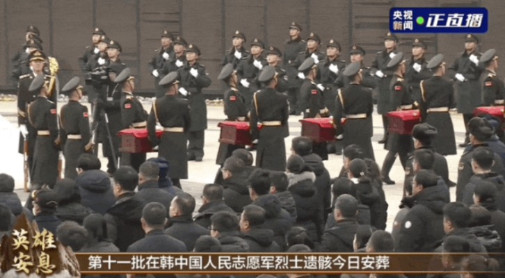 4月23日,第十三批在韓中國人民志願軍烈士遺骸安葬儀式在瀋陽抗美援朝烈士陵園舉行。圖片來源:新華社 4月22日,第十三批12位在韓志願軍烈士遺骸及相關遺物由中國空軍運-20B運輸機從韓國接回至遼寧瀋陽。運-20B運輸機進入中國領空後,4架殲-20戰機護航伴飛,以最高禮儀致敬先烈。 參加迎回儀式的有中國社會各界代表1800多人,包括抗美援朝老戰士、烈士家屬代表、抗美援朝英雄連隊官兵代表、英雄航天員、港澳台師生、青少年學生代表等。神舟二十號飛行乘組指令長陳冬也是其中之一。 自2014年以來,中韓雙方遵循國際法和人道主義原則,已連續成功交接13批共1023位在韓中國人民志願軍烈士遺骸。(完) 【編輯:彭玉婷】