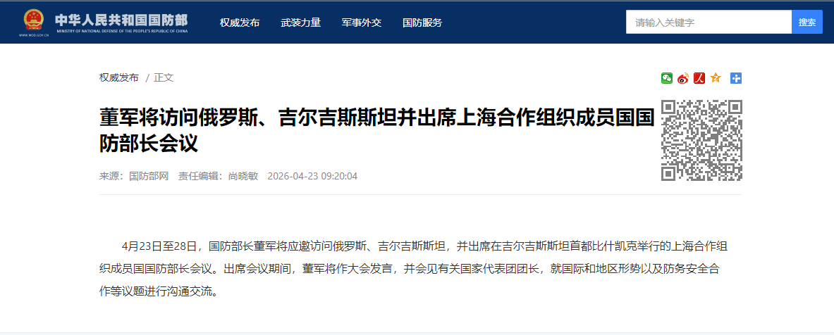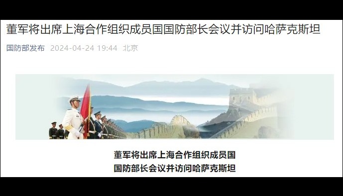 香港中通社4月23日電  據中國國防部網站23日消息,4月23日至28日,中國國防部長董軍將應邀訪問俄羅斯、吉爾吉斯斯坦,並出席在吉爾吉斯斯坦首都比什凱克舉行的上海合作組織成員國國防部長會議。