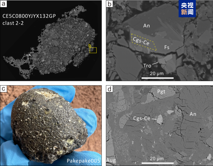 a: 嫦娥五號月壤;c: Pakepake005月球隕石;b,d: 鈰嫦娥石及其共生礦物 圖源:央視新聞 鎂嫦娥石和鈰嫦娥石是繼2022年嫦娥石之後,中國科學家發現的第二種、第三種月球新礦物,也是全球在返回月壤中發現的第七和第八種月球新礦物。這兩種月球新礦物均屬於稀土磷酸鹽礦物,隱匿於月壤微塵之中,粒徑僅數微米,晶體結構精妙獨特,在地球上沒有完全相同的對應礦物。(完) 【編輯:彭玉婷】