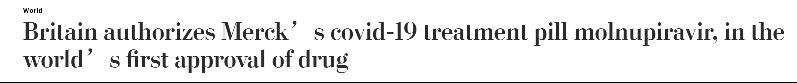 《華盛頓郵報》報道截圖 根據英國藥品與健康産品管理局(MHRA)的審批,莫那比拉韋将被用于治療新冠檢測陽性,且至少具有一種可能發展成重症的風險因素的輕中症成人新冠患者。 此前,10月1日,默克公司公布了莫那比拉韋臨床3期試驗中期分析數據,結果顯示,該藥物可将輕中症新冠患者住院或死亡風險降低約50%。 據英國廣播公司(BBC)2日報道,該臨床試驗計共有775名新冠患者參加,按一天兩次的劑量,給新确診的新冠患者服用莫那比拉韋。實驗結果發現,服用莫那比拉韋的患者中,有7.3%的患者需要住院治療,與之相比,服用安慰劑的患者有14.1%需要住院治療。 并且,服用莫那比拉韋的患者中沒有人死亡,但服用安慰劑的患者中有8人病逝。 不過,實驗結果表明,莫那比拉韋需要在症狀出現後盡早服用才能生效。之前針對新冠重症的住院病人進行的研究,數據并不樂觀,因此實驗停止。