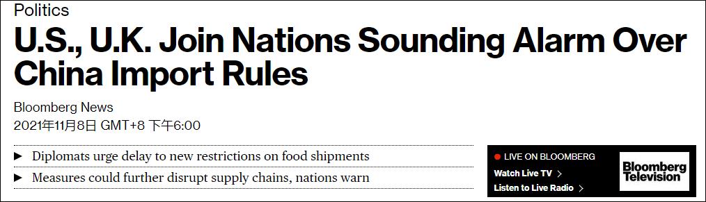 彭博社報道截圖 上述國家的外交人員聲稱,盡管他們國家的政府分別與中國海關總署進行了“大量接觸”,但仍認為中方4月出台的新規在執行情況和具體規定方面“缺乏明確性”。 這些外交人員在信中寫道,他們擔憂新規可能會使食品延遲進入中國、“擾亂全球食品供應鏈”,還質疑新規中的許多要求與受其影響的產品所呈現的風險水平“似乎並不相稱”。 他們隨後向中國海關總署建議,中方在執行新規前應通過世貿組織和雙邊方式,與貿易夥伴進行進一步討論和磋商,“強烈鼓勵”中方在實現食品安全目標過程中減少對進口食品的限制。 據彭博社報道,這7個經濟體的外交人員希望中國海關總署將上述新規推遲“至少18個月”。 聯名信中所指新規為中國海關總署於4月12日發布的海關總署第248號令(關於公布《中華人民共和國進口食品境外生產企業註冊管理規定》的令)和海關總署第249號令(關於公布《中華人民共和國進出口食品安全管理辦法》的令)。