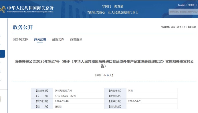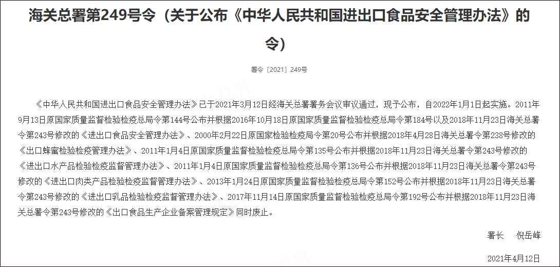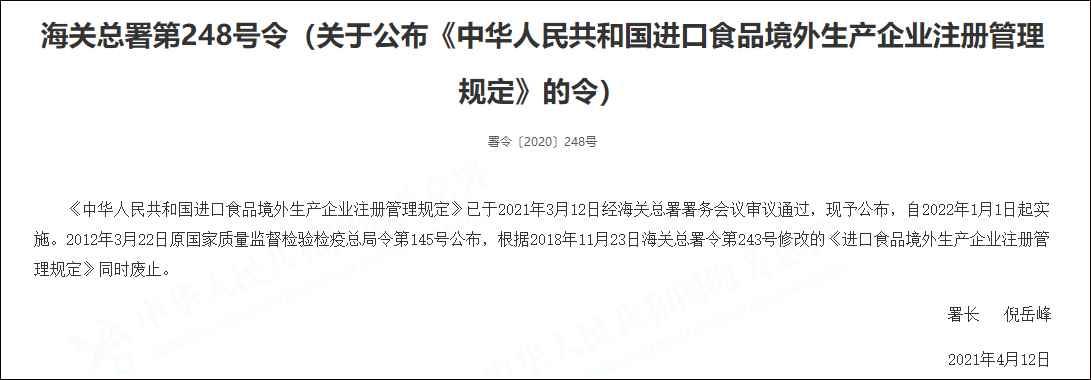 海關總署第248號令和第249號令 根據海關總署官網發布內容,第248號令明確了所有進口食品境外生產企業必須經海關總署註冊、註冊實施分類管理(分為“所在國家(地區)主管當局推薦註冊”和“企業申請註冊”兩種方式)。該新規將自2022年1月1日起施行。 第248號令的實施目的,是進一步發揮進口食品境外生產企業註冊制度在食品安全源頭治理中的重要作用,優化註冊程序,明確各方責任。在此新規出台之前,僅部分高風險食品(如肉類、魚類、乳制品和嬰幼兒配方食品)的生產商有註冊義務。 第249號令則是對進口食品標簽有了新規定,同樣自2022年1月1日起實施。 其中要求進口食品的包裝和標簽、標識應當符合中國法律法規和食品安全國家標準、依法應當有中文說明書,進口鮮凍肉類產品、進口水產品內外包裝上應當有牢固、清晰、易辨的中英文或者中文和出口國家(地區)文字標識,進口保健食品、特殊膳食用食品的中文標簽必須印制在最小銷售包裝上、不得加貼……