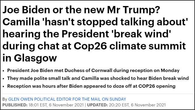 英媒爆料:拜登在氣候變化大會晚宴放響屁,把英王儲妃嚇一跳盡量不要在公眾場合出虛恭,如果忍不住,不要在英國王儲查理斯妻子卡米拉面前…… 英國小報《每日郵報》(Daily Mail)11月6日最先爆料,美國總統拜登在聯合國氣候變化大會(COP26)期間的一場宴會上,在和卡米拉交談時突然排下氣,“又長又響,令人無法忽視”,卡米拉被嚇了一跳且十分尷尬。卡米拉事後“逢人便說”(hasn't stopped talking)。