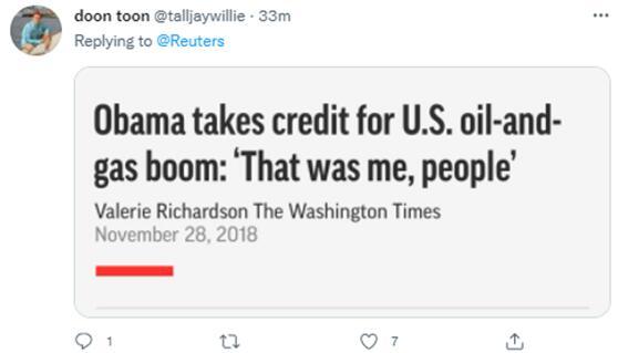 “說得好像他的無人機炸彈一點污染也沒有似的!” 還有網友“分享”了美聯社2018年一篇關於奧巴馬的新聞報道截圖,圖片中的標題醒目寫著:“奧巴馬對美國油氣行業繁榮(的成績)邀功:‘是我幹的。’”↓