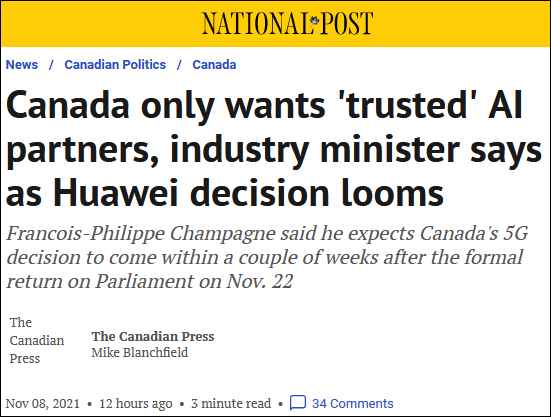 加拿大《全國郵報》轉載加拿大通訊社報道截圖 資料顯示,商鵬飛此前曾擔任過加拿大貿易部長、外交部長等重要職位,如今則是該國創新﹑科學及工業部長。他曾參與制定了加拿大的對華政策,也領導修訂過該國的外國投資國家安全審核法規。 目前,商鵬飛正在歐洲三國展開為期一周的訪問,並將於未來幾天內前往法國首都巴黎出席一個有關人工智能的重要國際會議。 據報道,商鵬飛11月8日在德國受訪時表示,他預計加拿大的5G決定將在11月22日新一屆國會正式回歸之後的幾周內作出。 “在這類事情上,國家安全是第一位的。我們經常想到道路和橋梁等基礎設施,但網絡基礎設施、電信基礎設施才是未來的發展方向。” 商鵬飛隨後這樣聲稱:“我認為,人們希望看到這種‘可信任夥伴’(建造)的虛擬網絡,能夠確保未來幾代人的記憶。” 加通社指出,5G網絡日後將依賴人工智能雲計算等技術,預計將改變人們的日常生活,實現諸如自動駕駛汽車和自動化醫療等工作。商鵬飛的這一發言,實際上已經表明加拿大即將拒絕中國通信業企業華為進入其國內5G網絡建設之中。 事實上,據報道,商鵬飛在當天的受訪發言中,除了在談及5G問題時說出所謂“可信任合作夥伴”之外,還曾在談及數據隱私問題時說過這一名詞。 雖然他沒有指名道姓,但加通社解讀,他針對的就是中國。他宣稱:“涉及數據隱私時,你必須睜大眼睛。當然,我認為,在這些關鍵技術的供應鏈方面,我們將繼續與我們信任的合作夥伴建立合作關系。”