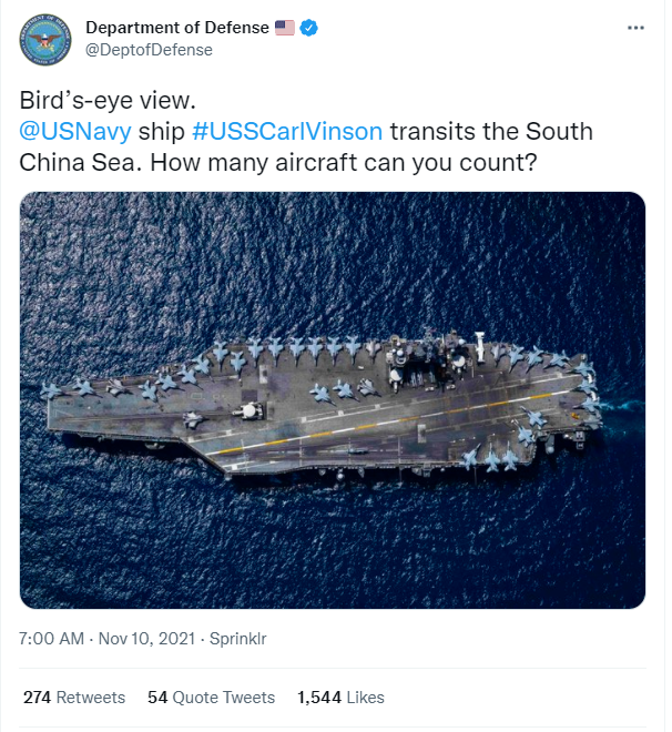 美國國防部官方推特賬號當地時間11月10日發了一條配圖的推文,炫耀其在南海航行的航母。這迅速引起許多網友的圍觀,而一些評論話風顯然不是美國軍方想看到的……