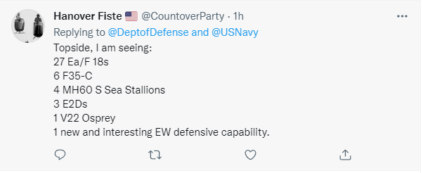 美國國防部的推文配了一張從高空俯拍的航母照片,並說:“鳥瞰圖。@美國海軍‘卡爾·文森’號航母經過南海。你能數出(甲板上)有多少架飛機嗎?” 這條推文迅速引起許多網友的圍觀和評論,有網友稱,在“卡爾·文森”號甲板上看到有20多架F/A-18,6架F-35C,以及若幹架E-2D“鷹眼”預警機、V-22“魚鷹”和艦載直升機等。但也有一些網友對於美國國防部在南海“秀肌肉”、炫耀武力的行為嗤之以鼻。