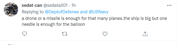 更有網友“不留情面”的說:“一架無人機或者一枚導彈就足以對付這麽多飛機。這艘船很大,但(別忘了)一根針就能刺破氣球。”
