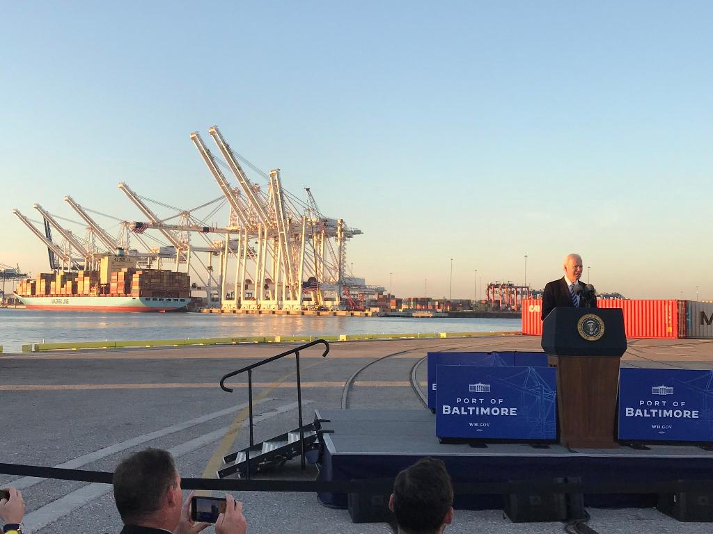 巴爾的摩港發布的背景圖,放大後可見“上海振華” 據《巴爾的摩太陽報》(The Baltimore Sun)11月10日報道,拜登當天於日落時分,在巴爾的摩港的敦達克海運碼頭(Dundalk Marine Terminal)開始演講。 “背景中隱約可見,用於從鄰近的西格特海運碼頭貨輪上吊起集裝箱的巨型起重機。附近卡車大小的集裝箱上,懸掛著紅、白、藍三色的旗幟。”報道中如是說道。 面對總統的到訪,巴爾的摩港的官方推特早早從11月8日起就放出了預告,以及演講的被進入。港口負責人多伊爾說:“我們期待並歡迎總統拜登於周三(10日)前往巴爾的摩港周三前往PoB考察正在進行的泊位項目、新的超大型起重機、已完成的疏浚作業,並討論未來將受益於兩黨基礎設施協議的項目。”