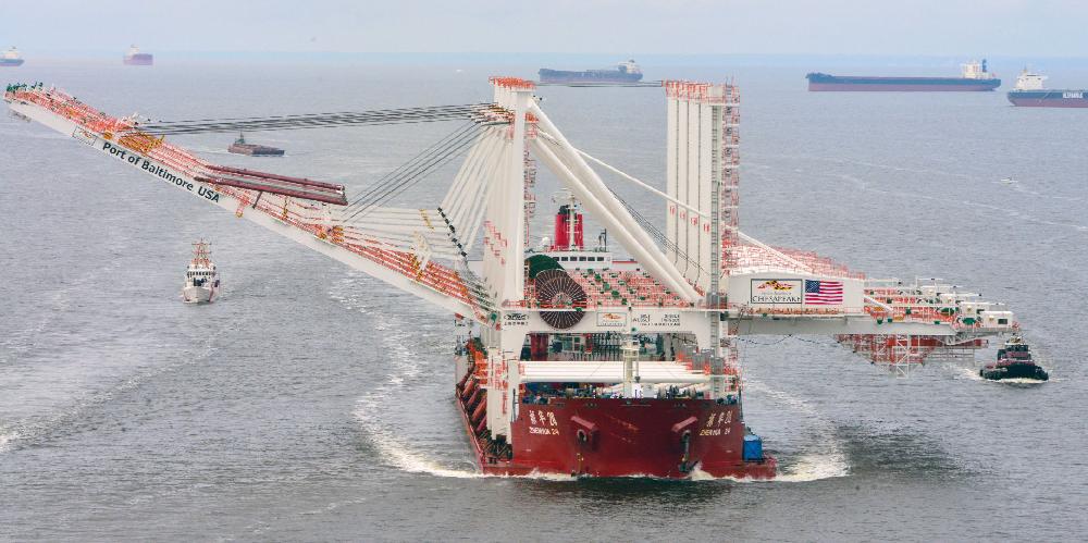 “振華24”運載的起重機 推特圖 根據規劃,這幾台起重機對港口有著至關重要的作用。根據《巴爾的摩太陽報》介紹,這4台“新巴拿馬式”起重機高約137米,重約1740噸,比巴爾的摩港現在使用的起重機高4.5米,重190噸。 新的起重機全電動,不耗費柴油,並能吊起約85噸的集裝箱。“南巴爾的摩新聞網”稱,這些起重機將可以讓碼頭工人同時卸下兩艘更大更寬的集裝箱船,堪稱港口擴建擴產計劃中的重要一步。