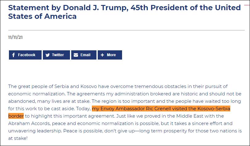 特朗普聲明 特朗普11日的聲明寫道:“偉大的塞爾維亞和科索沃人民在實現經濟正常化方面克服了巨大障礙,我的政府促成的協議是歷史性的,不應該被拋棄。” “今天,我的代表大使格雷內爾訪問了科索沃-塞爾維亞邊境,強調這一重要協議,正如我們通過亞伯拉罕協議在中東地區所證明的那樣,和平與經濟正常化是可能的,但需要真誠的努力和堅定不移的領導。” 科索沃是原南斯拉夫聯盟塞爾維亞共和國南部一個自治省。當地阿爾巴尼亞族分離主義武裝與政府軍1998年爆發衝突,其後北大西洋公約組織軍事介入,轟炸南聯盟。戰後,科索沃事實上脫離了塞爾維亞中央政府的管理,並於2008年2月單方面宣布“獨立”,獲得美國和其他一些西方國家承認,而塞爾維亞始終堅持對科索沃擁有主權。 2020年9月4日,特朗普在白宮會見塞爾維亞總統武契奇和時任科索沃“總理”阿夫杜拉·霍蒂(Avdullah Hoti),在特朗普的主持下,武契奇和霍蒂簽署了一項“經濟正常化”協議。 推動塞爾維亞和科索沃經濟關係正常化,是特朗普津津樂道的“外交政績”之一,他也因此獲得瑞典議員提名角逐2021年諾貝爾和平獎。