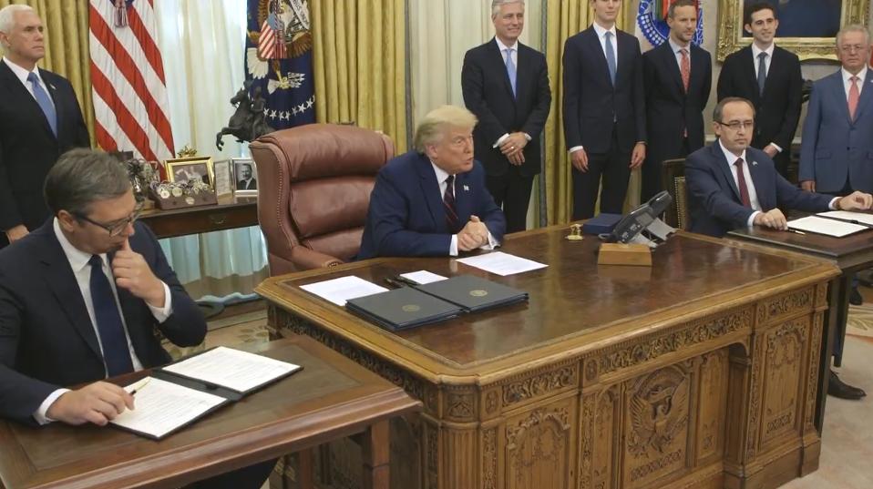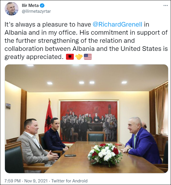 三方領導人在白宮舉行簽字儀式,視頻截圖 格雷內爾曾在2018年至2020年間擔任美國駐德國大使,此後曾任特朗普塞爾維亞-科索沃和平談判特使。他此行除了前往科索沃與塞爾維亞“邊境”,還訪問了阿爾巴尼亞,與該國總統梅塔(Ilir Meta)會面。 梅塔在推特表示,格雷內爾“承諾支持進一步加強阿爾巴尼亞與美國之間的關係與合作,我們對此深表贊賞”,並在推文中加上了兩國國旗和握手的表情,仿佛是官方間的交流。