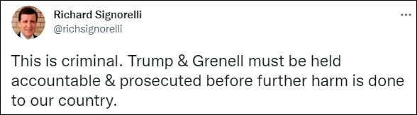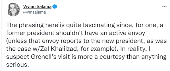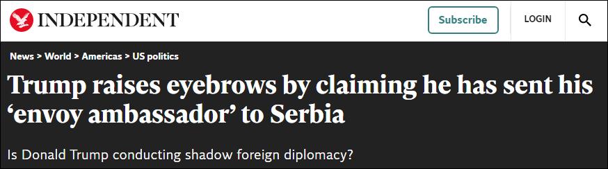 《獨立報》網站截圖 不少美國專家、媒體人也對此議論紛紛。加拿大Global News駐華盛頓分社社長普羅斯科(Jackson Proskow)在推特寫道:“這位前總統派遣了一名‘代表’進行外交活動”。 曾任檢察官的西格諾雷利(Richard Signorelli)認為有關行為是“犯罪”,“在對我們的國家造成進一步傷害之前,特朗普和格雷內爾必須被追究責任和起訴。” 《華爾街日報》記者薩拉馬 (Vivian Salama))則認為,前總統不該有一個活躍的代表,格雷內爾的訪問更多是禮節性的,而不是去討論嚴肅的事情。