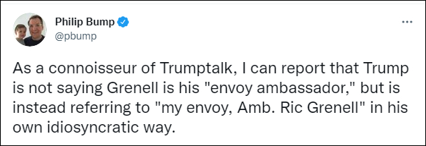 也有人注意到了特朗普奇怪的表述,從級別上說,“envoy(使者、代表)”要低於“ambassador(大使)”,而特朗普卻將它們並列稱呼。《華盛頓郵報》記者菲利普·邦普(Philip Bump)揶俞道,特朗普可能不是說格雷內爾是他的“大使”,而是以他獨特的方式,稱之為“我的代表,格雷內爾大使”。