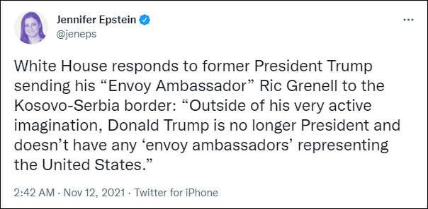彭博社白宮記者愛潑斯坦(Jennifer Epstein)推特截圖 當地時間11日,格雷內爾在科索沃和塞爾維亞的邊檢站附近受訪時,首先強調他已經不再為美國政府工作,“我以一個普通公民的身份來到這裏,只是作為特朗普政府的一位普通公民”。 “我來到這裏,因為我們是失意的前特朗普政府官員。”格雷內爾說,科索沃和塞爾維亞達成的經濟協議與政治無關,而是關乎經濟發展,希望看到經濟協議得到實施。 盡管一再強調“與政治無關”,但在談及特朗普政府和拜登政府在科索沃問題上的表現時,格雷內爾仍免不了“拉踩”一番。 他表示,拜登政府必須發揮更積極的作用,“他們在科索沃沒有大使,也沒有總統特使……我還沒看到他們談論這些事……特朗普政府所做的是,讓我們拋開政治話題,做特朗普最擅長的事,那就是創造就業,在經濟中創造動力。”