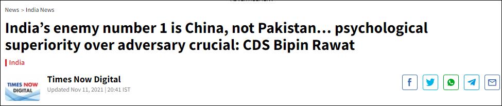 印度國防參謀長聲稱:中國是印度最大的安全威脅拿邊境問題做文章還不夠,11日,印度直接將中國稱作“最大安全威脅”。 11月11日,印度國防參謀長比平·拉瓦特(Bipin Rawat)聲稱,“中國是我們今天最大的敵人,而不是巴基斯坦。”拉瓦特還稱,如果要與中國作戰,將會同時爭取美國和俄羅斯的支持。