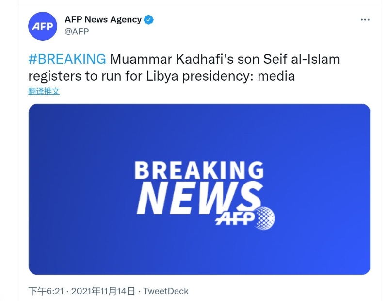 據法新社剛剛消息,利比亞前領導人穆阿邁爾·卡紮菲的兒子賽義夫·伊斯蘭當地時間13日登記競選利比亞總統。 據新華社此前報道,賽義夫·伊斯蘭曾被視為卡紮菲接班人。2011年11月在利比亞西部津坦市被一支民兵武裝抓獲。4年後,的黎波里一家法院缺席判處賽義夫·伊斯蘭死刑。那支民兵武裝2017年說,賽義夫·伊斯蘭已經獲釋。 國際刑事法院檢察官2019年說,“可靠”消息顯示,賽義夫·伊斯蘭身在津坦。按照法新社的說法,自2014年6月以來,就沒有人見過他。 卡紮菲政權2011年被推翻後,利比亞陷入動蕩。在聯合國斡旋下,利比亞衝突方去年10月在瑞士日內瓦簽署全面停火協議,並於11月在突尼斯舉行的政治對話期間就“通往選舉的路線圖”達成一致,同意2021年12月舉行總統和議會選舉。
