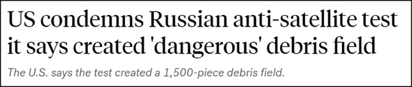 NASA聲稱:俄羅斯反衛星武器試驗,或傷及中國空間站據美國廣播公司(ABC)當地時間11月15日報道,美國政府當天指責俄羅斯試驗反衛星武器,在近地軌道上制造了一片“太空垃圾雲”,威脅到國際空間站航天員的安全。 美國航空航天局(NASA)形容俄羅斯這一舉動為“不負責任的試驗”,局長尼爾森在一份聲明中聲稱,試驗造成的衛星碎片可能會同時對國際空間站和中國空間站造成威脅。