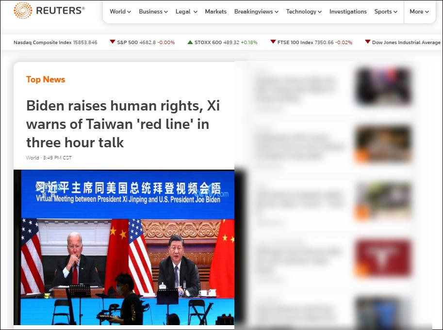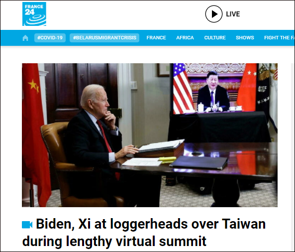 日本外相林芳正 圖源:日本共同社 然而,在承認會晤有利於“彌足兩國關係間的鴻溝”後,包括BBC、《衛報》、路透社在內的歐洲媒體則更加關注其他中美分歧所在,如台灣問題。 歐洲媒體炒作台灣問題 其實,美媒在報道中美元首視頻會晤“坦率而直接”時,同樣提到了中方在台灣問題上的強硬表態。例如,《紐約時報》援引中方“玩火者必自焚”的表述後,指出台灣問題無疑是中美間問題中最熱門的那一個。 然而,這個“最熱門的中美關係問題”卻被以英國為首的歐洲主流媒體大肆渲染。 “玩火者自焚”、“中方警告美國”、“中美在台灣問題上不和”……一時間,台灣問題相繼出現在BBC、《衛報》、路透社、法蘭西24電視台等媒體網站首頁。