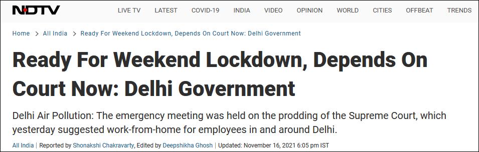 印度新德里電視台:政府準備在周末封城,等待法院指令 據印度新德里電視台(NDTV)16日報道,德里15日這天的空氣質量指數(AQI)達到343,惡化至“非常糟糕”(very poor)的級別。在同一天最高法院下令召開的緊急會議上,德里政府建議暫停該市的建築和工業活動,並建議在本周末實施類似疫情期間的緊急封鎖,讓人們在家里工作一周時間,以應對首都日益嚴峻的空氣污染危機。 德里發展部長戈帕爾·拉伊(Gopal Rai)表示,“我們已經提議在周末實施封鎖,我們已經為此做好了準備,現在將取決於法院下達的指示。”德里市政府也在一份文件中表示,如果在整個印度國家首都區(NCR)實施完全封鎖,將是有意義的措施。因為考慮到德里的面積有限,若想有效控制空氣污染,僅靠的德里一座城市是不夠的。 最高法院回應稱,他們將與印度中央政府召開緊急會議商討此事,印度國家首都區將考慮給當地居民實行為期一周的遠程辦公。 過去幾周,德里的污染水平比世衛組織標定的安全限制高出20倍,整個城市上空籠罩著濃厚的棕色煙霧,已演變成一場可怕的季節性事件。德里和周邊幾個邦已經關閉了學校,應對本輪致命的污染。