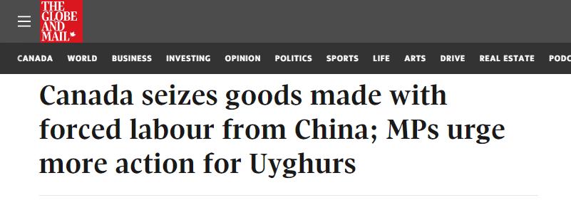 《環球郵報》報道截圖 據加拿大《環球郵報》11月16日報道,加拿大於2020年中頒佈禁令,並在2021年1月12日出台措施,打擊所謂中國“強迫勞動”商品的進口。而今年3月,加拿大邊境服務局(Canada Border Services Agency,CBSA)曾告訴該報,自新規定生效後,並沒有因“強迫勞動”扣押過任何從中國進口的商品。 但到了11月12日,該報再次問詢是否自2020年以來扣押過中國商品時,邊境服務局則承認有過一次。邊境服務局稱,扣押商品是從中國運抵魁北克的女性服裝和兒童服裝,理由是這些服裝“由強迫勞動制造或生產”。 另外,邊境服務局拒絕公佈進口商,只稱這是保密信息,同時也未透露具體商品的扣押日期,僅稱扣押日期發生在11月3日之前。