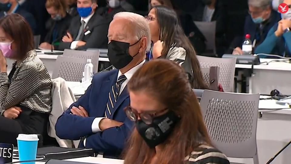 拜登登機時摔跤。圖源:社交媒體 就在剛剛結束不久的COP26大會上,拜登還被曝在聽演講時睡著了。更有英媒爆料:拜登在氣候變化大會晚宴放響屁,把英王儲妃嚇一跳。