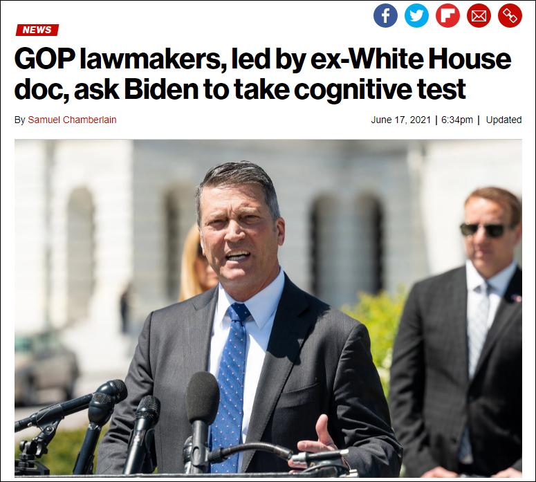 拜登在Cop26氣候大會上睡覺。圖自英國《獨立日報》 此外,美國共和黨和民主黨的黨派鬥爭也延申到對拜登身體健康方面的攻擊。據《紐約郵報》今年6月17日報道,美國共和黨眾議員、前白宮醫生羅尼·傑克遜(Ronny Jackson)稱,拜登的精神狀態和智力狀況已經不適合繼續擔任總統這個職位。 傑克遜舉出拜登精神衰弱和健忘的例子,今年3月份拜登忘記了國防部長勞埃德·奧斯汀的名字;今年2月去在德克薩斯州訪問時,拜登忘了訪問目的,問周圍的人“我在這里做什麽?”;拜登在背誦《獨立宣言》第一行時忘詞等。傑克遜稱,大多數學齡兒童都能背誦那句著名而受人尊敬的愛國語句,拜登卻不能。 傑克遜還和14名共和黨議員“聯名上表”白宮,希望拜登可以去做一次認知測試,被白宮直接回絕。