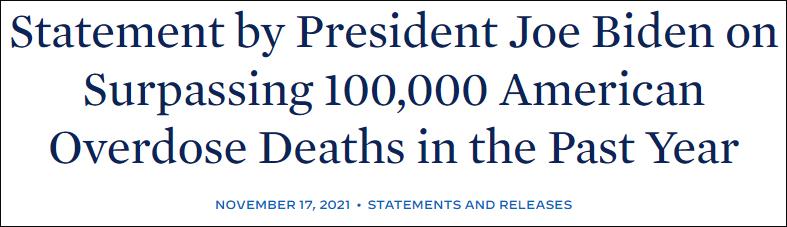 題為“拜登總統關於去年美國藥物過量死亡人數超10萬的聲明”。來源:白宮網站聲明截圖 美聯社稱,最新的死亡數據是美國疾病控制與預防中心(CDC)提供的,他們根據迄今為止收到的9.8萬份死亡報告做出了估計,結論是在2020年4月到2021年4月,約有100300名美國人死於藥物注射過量。報道稱,這不是一個正式的統計結果,確切數據預計還得等幾個月才能出來。 今年7月,CDC曾發佈正式報告,稱美國2020年全年約有9.3萬人死於藥物注射過量,創下歷史新高。有CDC官員表示,2021年這一數據預計將超過10萬。