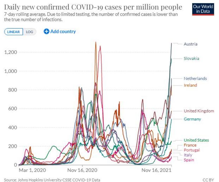 除了德國、俄羅斯以外,當前整個歐洲的疫情形勢都不容樂觀。其中,奧地利的疫情形勢尤其嚴峻。 11月19日,奧地利衛生部公佈的數據顯示,該國過去24小時新增新冠確診病例15809例,創下疫情暴發以來單日新增最高紀錄;累計確診病例超過100萬例;新增死亡病例48例,累計死亡11951例。 隨後,奧地利政府宣佈,自11月22日起,對全國所有居民實施為期10天的“封禁”措施,之後根據疫情評估形勢可能再延長10天,最遲20天后回到僅對未接種疫苗者實施“封禁”的狀態,并從2022年2月起實行強制性疫苗接種。 這是自疫情暴發以來奧地利第四次宣佈全國性“封禁”。該國也將成為歐盟第一個實行強制性疫苗接種的國家。 除了奧地利,波蘭、匈牙利、斯洛文尼亞、克羅地亞、希臘、荷蘭、愛爾蘭等國新增確診病例數也在近日陸續創下新高,多國醫療系統承受重壓。其中,愛爾蘭頒佈了新的限制規定,希臘宣佈加強對未接種疫苗人群的行動限制;波蘭衛生部長涅傑爾斯基表示,波蘭下月或將迎來新一波疫情感染高峰,而目前該國用於收治新冠患者的病床佔用率已達72%。