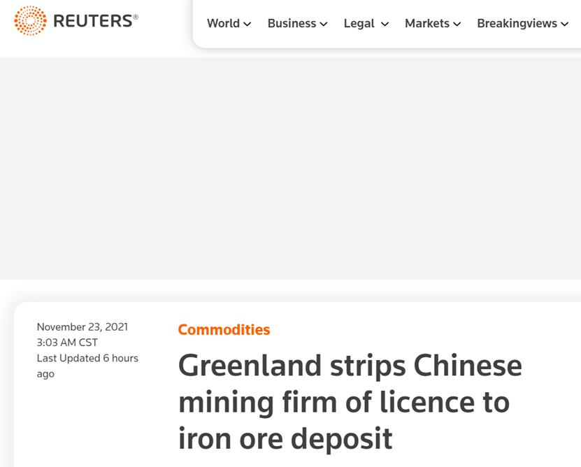 據英國路透社報道,格陵蘭島自治政府22日發佈消息稱,已撤銷一家中國礦業公司在首府努克附近開採鐵礦石的許可證。路透社稱,這一決定給希望在資源豐富的格陵蘭島站穩腳跟的中國企業“帶來了打擊”。