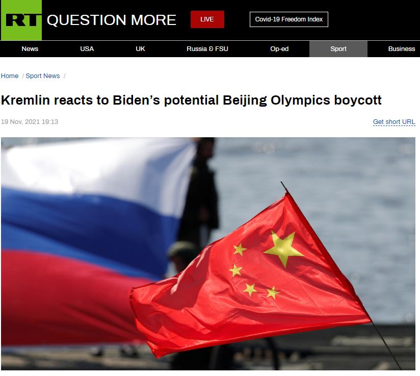 “今日俄羅斯”報道截圖 俄羅斯體育快報(sport express)援引俄國家杜馬議員、速滑奧運冠軍茹羅娃(Zhurova)評論稱,美國政客對於冬奧會的抵制,只不過是杯水車薪。“對中國和世界體育來說,美國政客的抵制無關緊要。2014年索契冬奧會,他們不是也喊著要抵制。” 另一名議員德米特里·斯維舍夫(Dmitry Svishchev)也有類似的看法,他認為“美國想要持續向中國施壓,但中國是一個大國,這麽做不會有任何結果。如果美國不參加冬奧會,中國不會因此失去任何東西,奧運會的吸引力也不會減少。” 俄羅斯總統普京已經收到了出席北京冬奧會開幕式的邀請。“在所有細節敲定後,我們將與中方合作夥伴共同發表聲明。”克里姆林宮發言人佩斯科夫說。 中國外交部發言人趙立堅22日表示,中方多次強調,北京冬奧會是世界各國冬奧運動員的舞台,他們才是主角。中方堅信在奧林匹克精神的指引下,在各方共同努力下,我們一定能為世界呈現一屆簡約安全、精彩的奧運盛會,共同推動國際體育事業的健康發展。中方一貫堅決反對任何將體育運動政治化和違背奧林匹克憲章精神的言行,有關炒作只會損害各國運動員的利益。 【編輯:胡雪石】