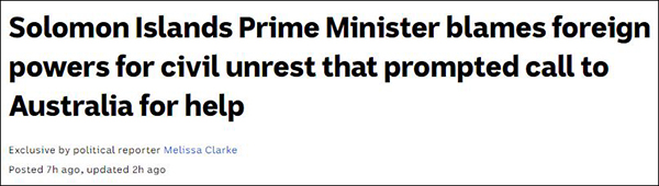 所羅門群島總理索加瓦雷 圖源:聯合國網站 澳外交部長瑪麗斯·佩恩(Marise Payne)今天在接受ABC採訪時被問到:澳方是否也持“所羅門群島騷亂是受外部勢力煽動”的觀點? 佩恩回應稱,澳方“根本就沒表明過(上述觀點)”。她稱澳方意見一直很清楚,即“不想看到暴力,非常希望(所羅門群島)恢復穩定。” 她還強調,澳方之所以是“挺身而出”派遣警察人員赴該國是因為兩國間一直存在“雙邊安全條約”,而澳政府“無意以任何方式干涉所羅門群島的內政”。 澳大利亞廣播公司(ABC)也在其報道中反復強調,澳派遣警察等力量赴該國是“應其總理索加瓦雷的請求”。澳總理莫里森對此也很“謹慎”,稱派遣行動“並不表明澳方對該國內部問題持任何立場”。 報道稱,“索加瓦雷代表所羅門群島人民感謝澳方幫助”,並稱澳大利亞是“最好的朋友”。 2003年至2017年間,由澳大利亞主導的一支名為“所羅門群島區域援助團”(RAMSI)的國際安全部隊曾在所羅門群島幫助其“改善治安狀況”。 昨晚,已有23名澳警察和外交人員飛抵所羅門群島,報道稱,還有50名警察以及43名澳國防軍人員以及一艘澳海軍巡邏艇預計將在今天(26日)抵達該國。 對此,美聯社則在一旁似有所指地說道,“澳大利亞不會協助所羅門群島保護其國民議會和行政大樓”。 報道還援引一些觀察人士的話稱,“澳大利亞迅速對此進行干預,是為了避免中國安全力量進入該國並幫該國恢復秩序。” 《紐約時報》25日援引澳大利亞前駐所羅門群島外交官索拉(Mihai Sora)的話稱,所羅門群島近年來一直處於地緣政治競爭的中心。在所羅門群島與中國大陸建交後,馬萊塔省仍繼續與台當局保持聯繫,違反了所羅門群島中央政府的立場。而美國則直接向馬萊塔提供外援(direct foreign aid),加深了該國內部的裂痕。