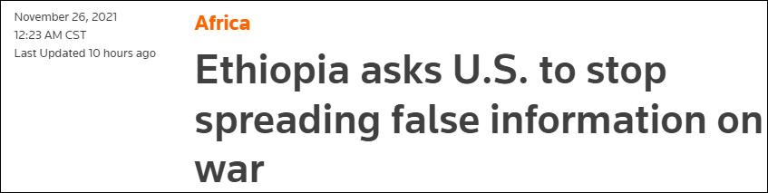 埃塞俄比亞部長:美國,停止散佈我們的“可恥假新聞”據路透社11月26日報道,在美國國務院發佈關於潛在“恐怖襲擊”的警告後,埃塞俄比亞負責通訊的國務部長25日表示,埃塞政府已要求美國停止傳播針對該國的虛假信息。 由阿比·艾哈邁德(Abiy Ahmed)領導的埃塞政府和北部提格雷地區反政府武裝之間的衝突,已經持續了一年多,造成這個非洲人口第二多國家的成千上萬人死亡,數百萬人流離失所。 本周,愛爾蘭政府表示,由於愛爾蘭對這場衝突的立場,其6名外交官中的4名已遭埃塞驅逐。埃塞政府發言人也對未點名的外部威脅發出警告,並認為戰爭相關報道不準確,為此批評西方國家政府。 路透社援引埃塞國家廣播公司EBC報道稱,埃塞國務部長克貝德·德西薩(Kebede Dessisa)表示,美國政府應避免傳播“關於埃塞的可恥假新聞和誹謗”。